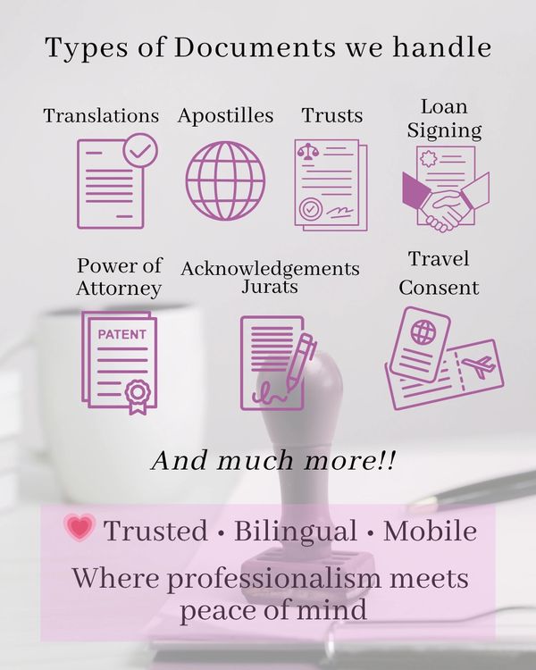We handle a wide range of documents including power of attorney, trusts, apostilles, certified translations, travel consent forms, and more. Whether you need a single notarization or multiple signatures, our bilingual notary services make the process fast, easy, best part is I will come to you!